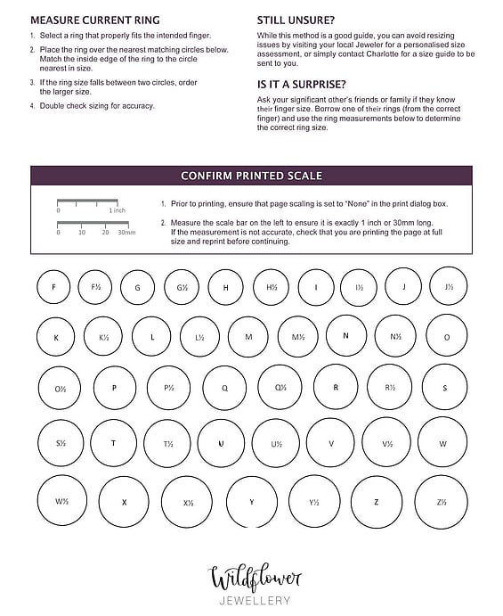 Wanting to know what size Ring you are? Then simply download the Ring sizing chart to help find the correct size for your beautiful Wild Flower Ring. If you have any questions about sizing, please do not hesitate to contact Charlotte at charlotte@wildflowerjewellery.nz